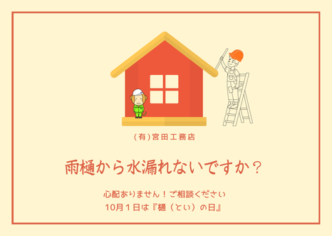 10月1日は『雨と(10)い(1)の日』です。雨樋は外壁の汚れや腐食から守る大切な部材です。これからの季節は落ち葉などが原因で詰まる事があります。季節が変わる時や大雨、台風の後に目視にて確認。曲がったり、垂れ下がったり見つけた時はご相談ください。